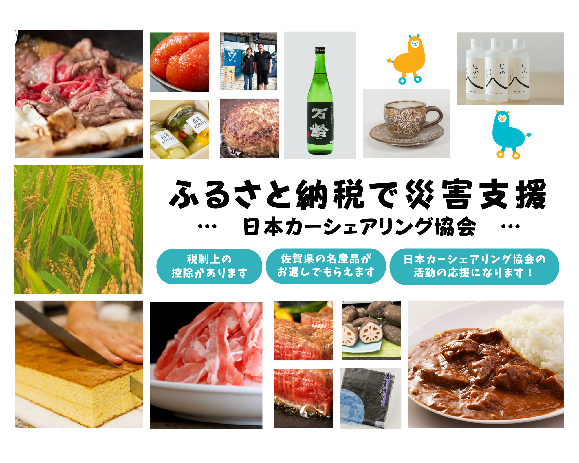 佐賀県外にお住まいの方が日本カーシェアリング協会指定で佐賀県庁へふるさと納税された場合、1万円以上のご寄附にはお選びいただいた地場産品のお礼の品を当協会から送らせていただきます。*