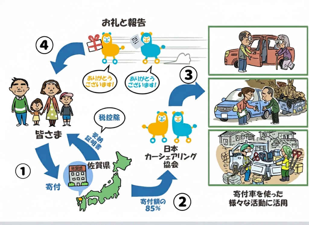 お預かりした寄附金を活用して、寄付車を使ったコミュニティづくり、災害支援などの活動を佐賀県を問わず日本全国で実施していきます。