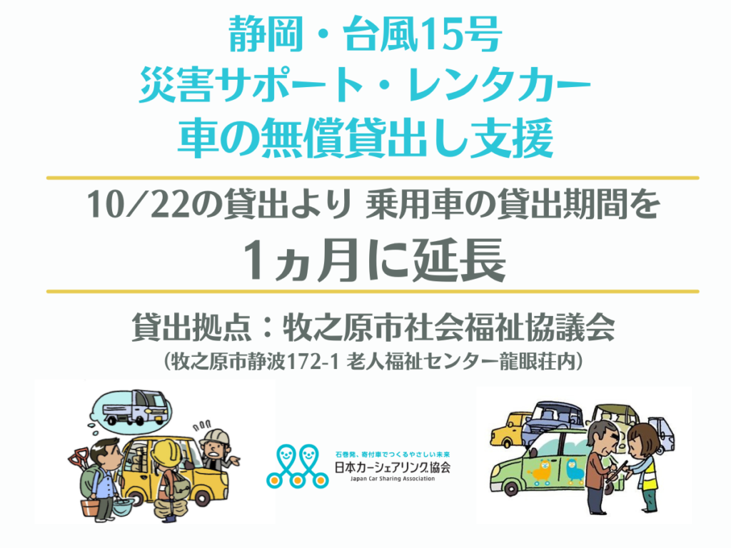 先行して富士市で開始した台風15号における車の無償貸出支援『災害サポートレンタカー』を牧之原市内で行えることになりました。