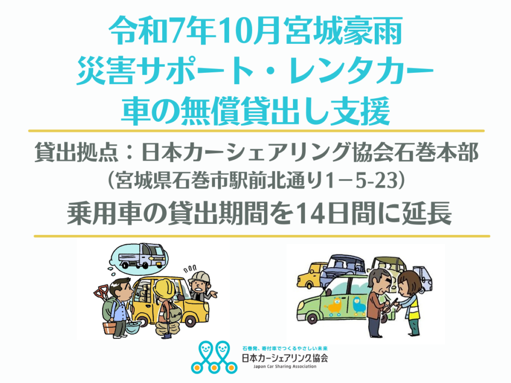 宮城県内で発生した豪雨に伴い、本日(10月2日)から車の無償貸出支援『災害サポートレンタカー』申込受付を開始します。