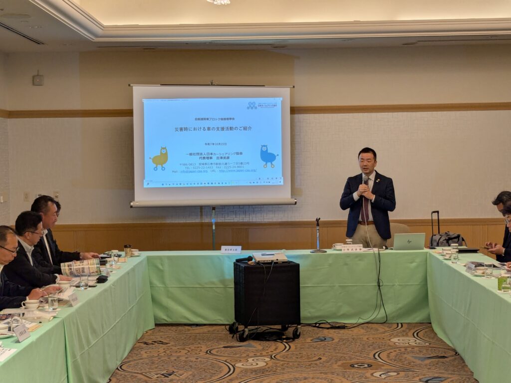 こうした中、先月と今月、災害への備えを共に考える貴重な機会をいただきました。 10月22日には「自販連関東ブロック 専務理事会議」、11月11日には「自販連長野県支部 経営者会議」にお招きいただき、私たちの活動事例を紹介させていただきました。