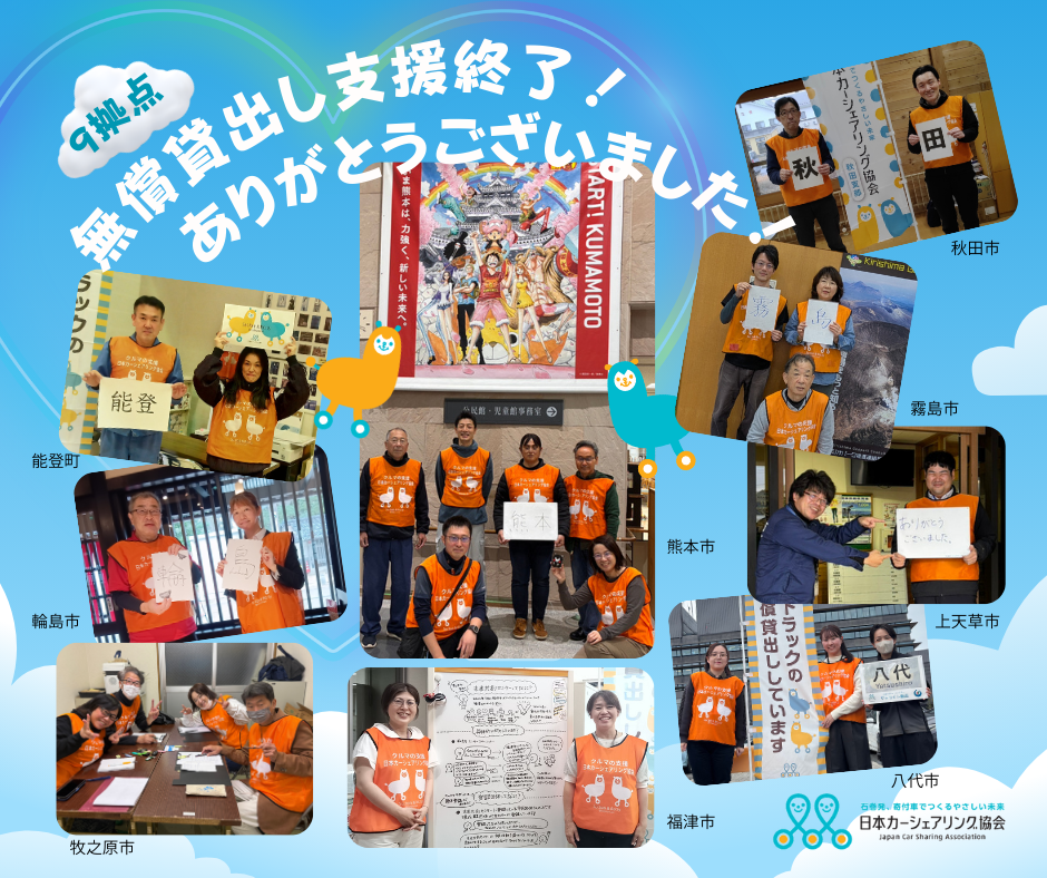 12月25日をもって、9つの拠点(能登町・輪島市・熊本市・八代市・上天草市・福津市・霧島市・牧之原市・秋田市)で無償貸出支援事業は終了しました。※福津市は11月30日に先行して終了しました。