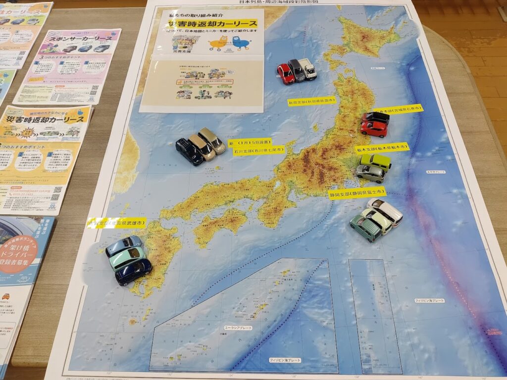 「遊学舎」をフル活用し、来場者の関心が集まるブースが並ぶ中、当協会のブースではパネル展示や映像・パンフレットを活用して、災害支援車両の無償貸出や車の寄付の仕組みについて説明しました。新たに導入した「日本地図+トミカ(ミニカー)」展示は、特に親子連れにとって分かりやすいと好評を得、会話がスムーズに進みました。
