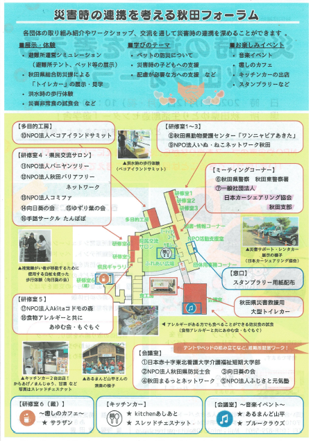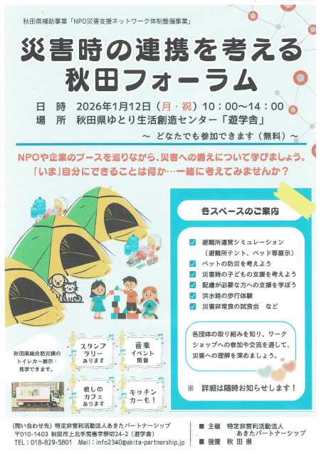 2026年1月12日(月)、秋田市「遊学舎」で開催された「災害時の連携を考える秋田フォーラム」に秋田支部でブースを出展しました。このフォーラムは、NPOや企業のブースを巡りながら、災害への備えや連携を考えることを目的に開催され、来場者と出展者との交流を深める貴重な場となりました。