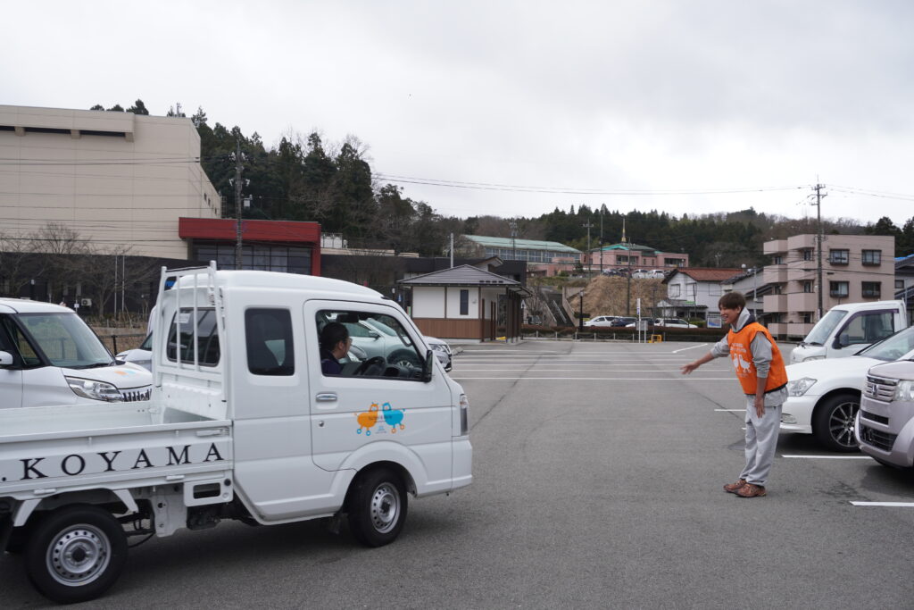 能登に来ていただき被災された方々へ自ら軽トラックをご案内し、お見送りしてくださっている様子
