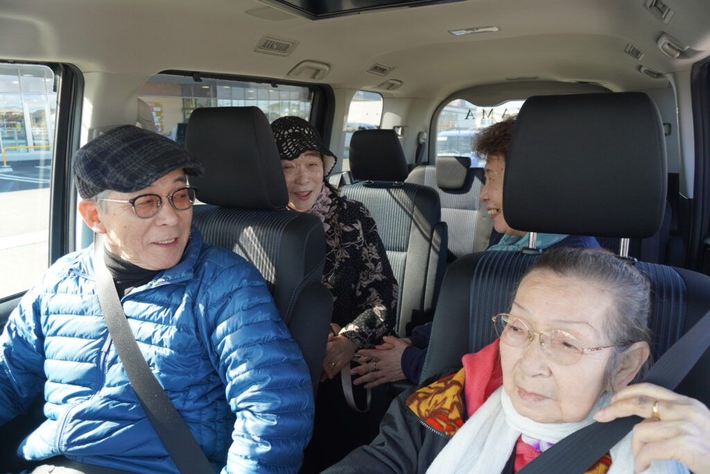 山下南カーシェア会の買い物ツアー参加者の皆さん。左はボランティアドライバーさん。買い物ツアーは定期的に開催されています。