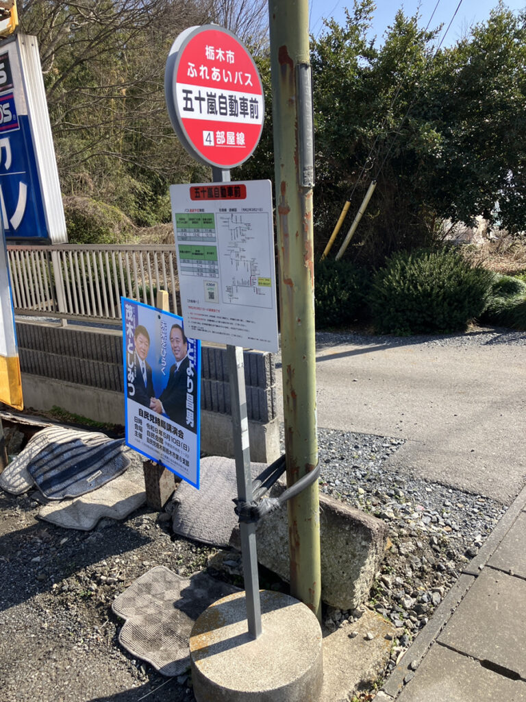 五十嵐自動車様はなんと目の前に栃木市ふれあいバスのバス停「五十嵐自動車前」があります。 バス停から0分ですので、車を運んでいただく架け橋ドライバーの皆さんにもとても便利ですね。
