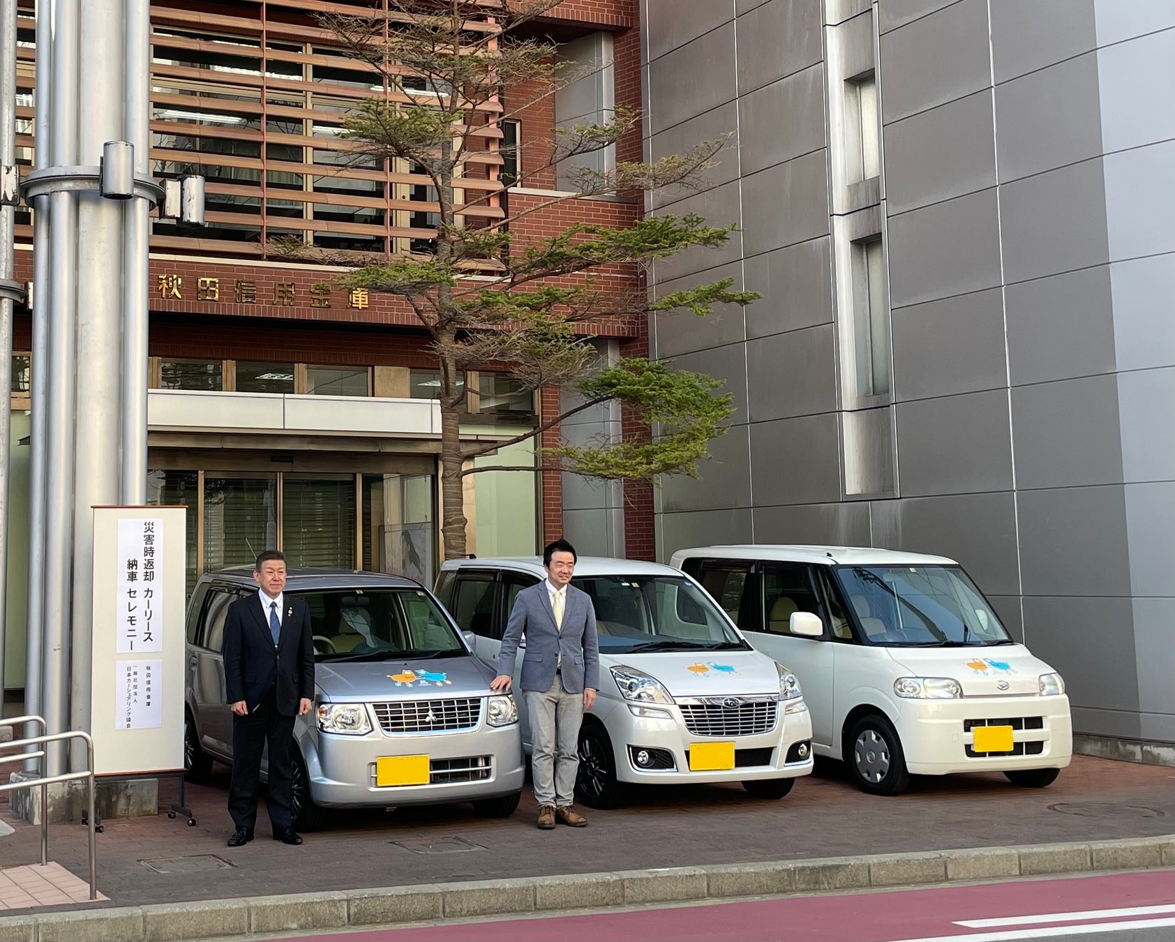 一般社団法人日本カーシェアリング協会2022年5月6日 11時00分2022年4月23日、一般社団法人日本カーシェアリング協会(宮城県石巻市 代表理事:吉澤武彦 以下「協会」)は秋田信用金庫(秋田県秋田市 理事長:菅原浩)に「災害時返却カーリース」で軽自動車6台を納車しました。秋田県内での本サービスの導入は本件が初めてです。同月27日に行われたセレモニーには秋田信用金庫の菅原浩理事長と、協会の吉澤武彦代表理事が参加しました。協会は今回の秋田信用金庫での災害時返却カーリースの導入をきっかけに、災害時に車がないことで困ってしまう方に迅速に車が届く仕組みが全国に広がっていくことを期待しています。