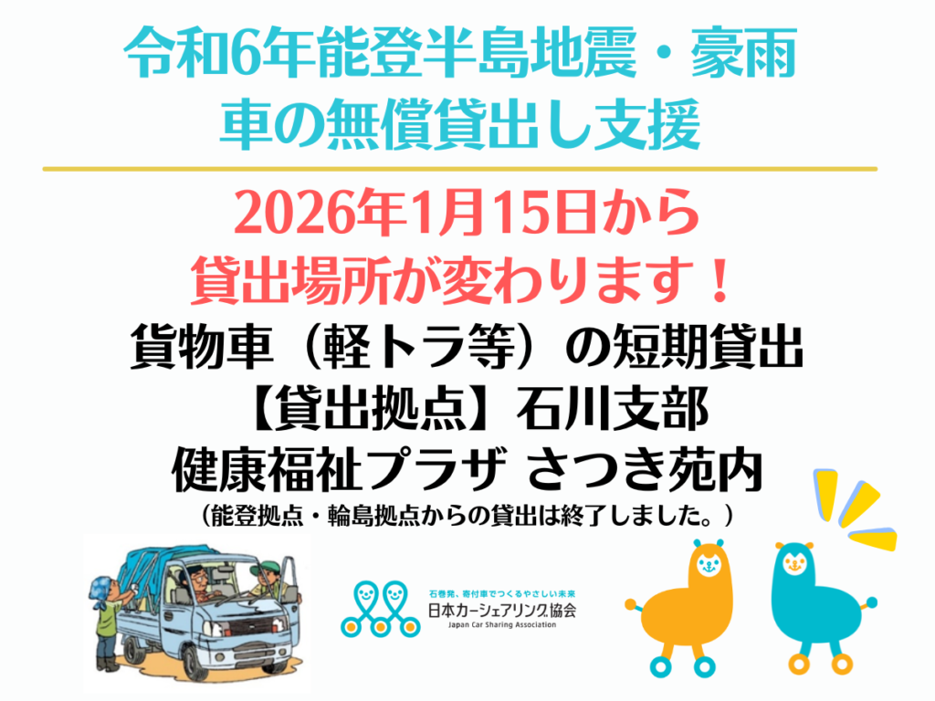 日本カーシェアリング協会では、1月15日より石川支部を設置し、能登半島地震で被災された方、地域活性、継続的復興支援を目的として活動をしてまいります。その一つとして貨物車両の短期無償貸出支援を継続いたします。この支援は、2026年1月15日から1年間を予定。従来通り、電話受付・WEBのお申込みとなりますので下記よりご利用いただけますと幸いです。